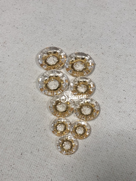 أزرار شفاف ذهبي الحجم: صغير : 1.5 سم (20 زر في البكيت) وسط: 2 سم (10 أزرار في البكيت) كبير: 2.5 سم ( 5أزرار في البكيت)